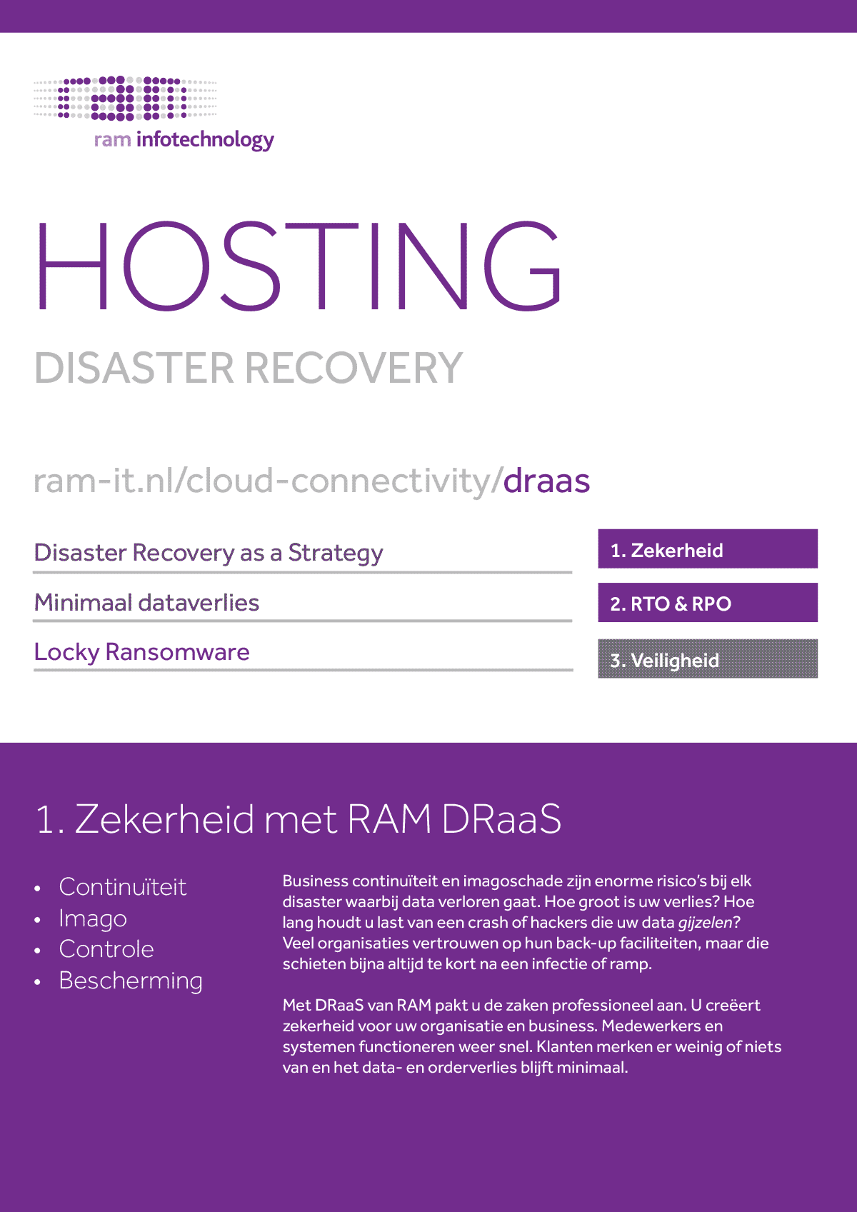 Met DRaaS van RAM-IT pakt u de zaken professioneel aan. U creëert zekerheid voor uw organisatie en business. Medewerkers en systemen functioneren weer snel. Klanten merken er weinig of niets van en het data- en orderverlies blijft minimaal.